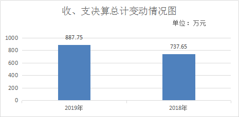 2019年度收、支总计887.75万元。与2018年相比,收、支总计各增加150.1万元,增长20.35%。主要变动原因是本年项目经费增加。(图1:收、支决算总计变动情况图)