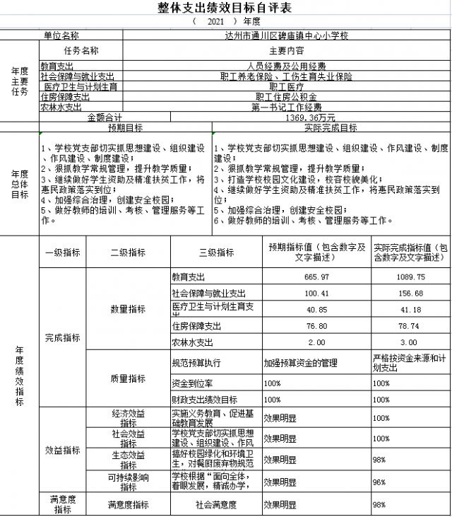 本部门按要求对2021年部门整体支出绩效评价情况开展自评,《达州市通川区碑庙镇中心小学校2021年部门整体支出绩效评价报告》见附件(附件1)。