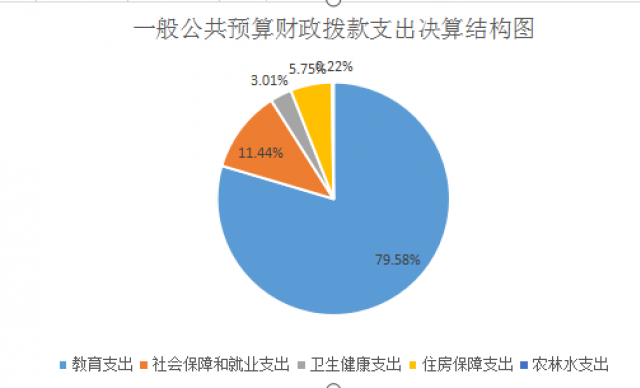 2021年一般公共预算财政拨款支出1369.36万元,主要用于以下方面:一般公共服务(类)支出0万元,占0%;教育支出(类)1089.75万元,占79.58%;科学技术(类)支出0万元,占0%;文化旅游体育与传媒(类)支出0万元,占0%;社会保障和就业(类)支出156.68万元,占11.44%;卫生健康支出41.18万元,占3.01%;住房保障支出78.74万元,占5.75%;农林水(类)支出3万元,占0.22%。