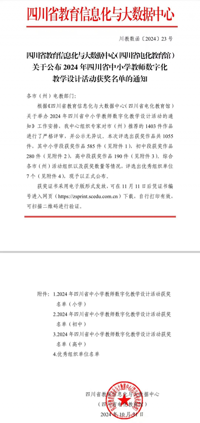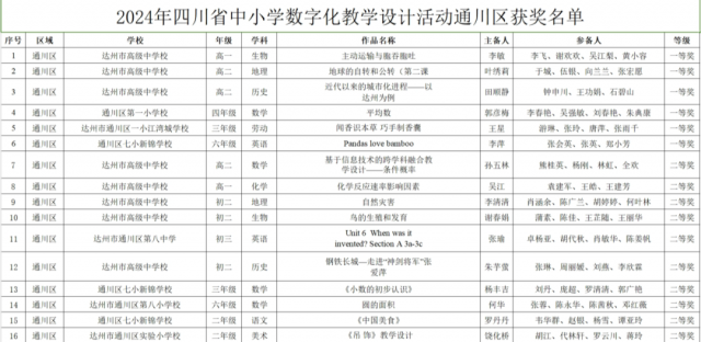 由四川省教育信息化与大数据中心(四川省电化教育馆)举办的2024年四川省中小学教师数字化教学设计活动获奖名单于近日公布,通川教师再创佳绩。荣获一等奖6个,二等奖10个,三等奖12个。